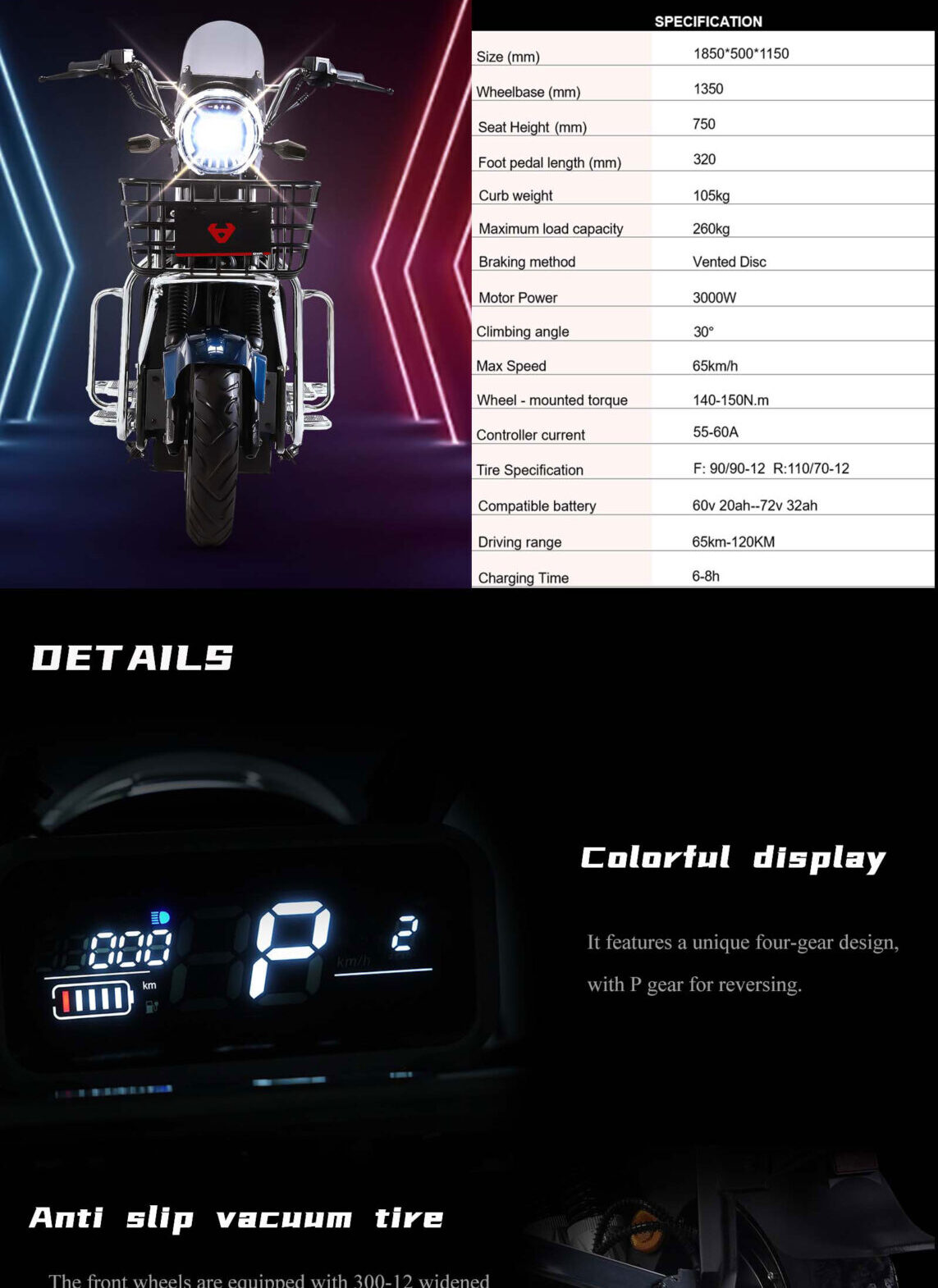 Compatible with 60V–72V batteries (20Ah–32Ah) for a 65km–120KM driving range (ideal for all-day use).